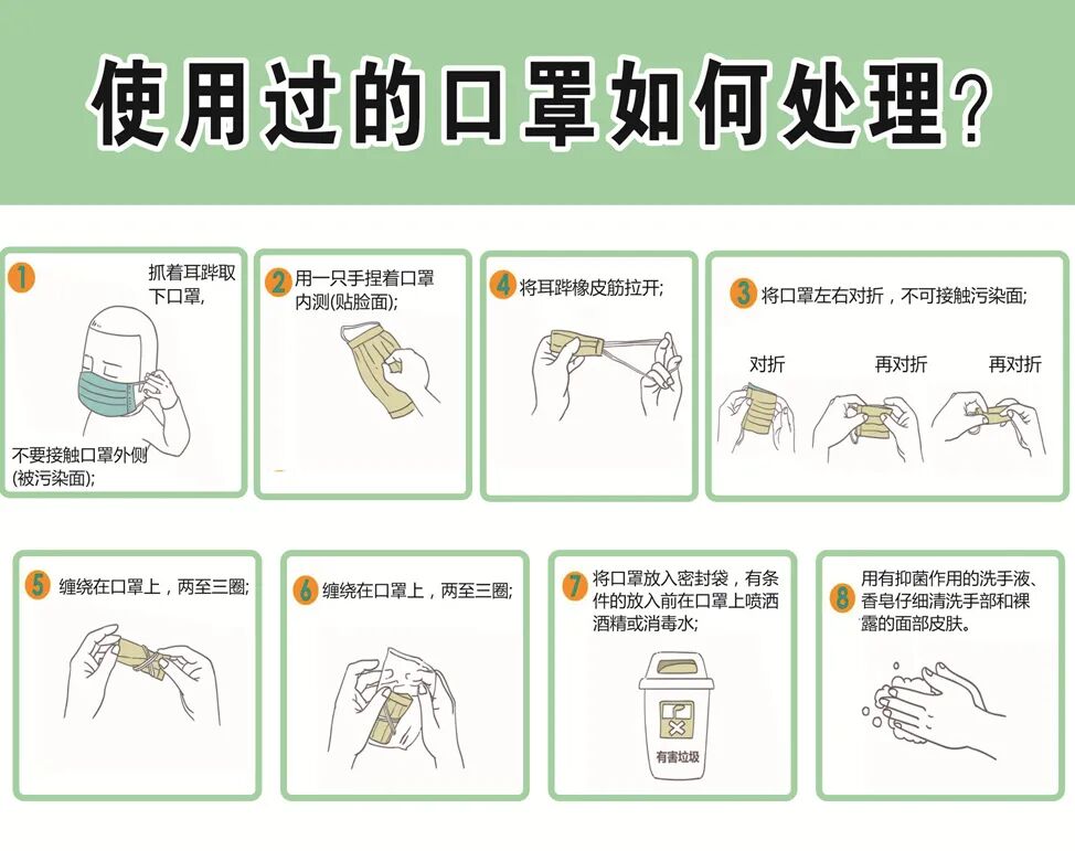 (1)健康人群使用后的口罩,按照生活垃圾分类的要求处理即可。 (2)疑似病例或确诊病例佩戴的口罩,不可随意丢弃,应视作医疗废弃物,严格按照医疗废弃物有关流程处理。 八:怎样保证洗手效果?