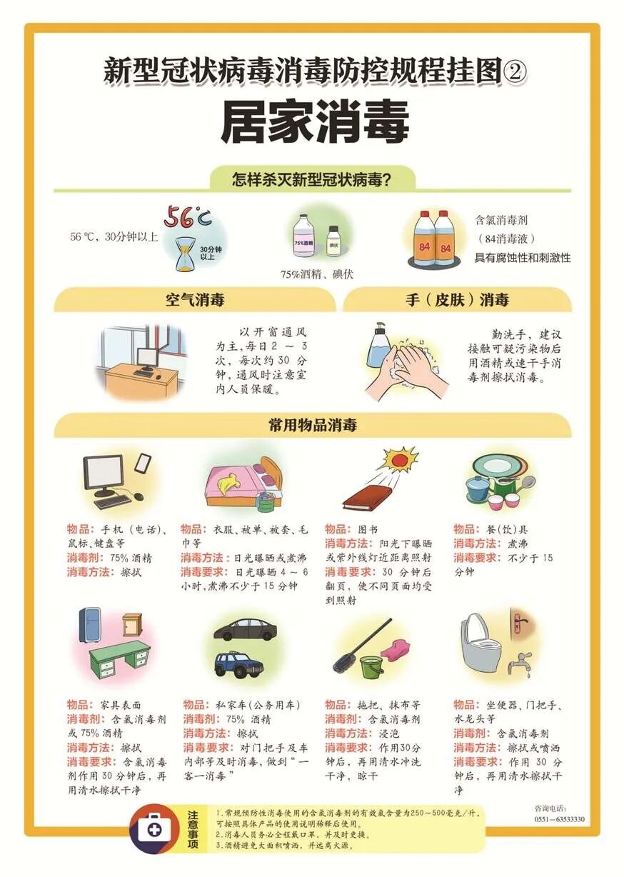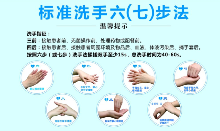 洗手是减少手部细菌、病毒最直接最有效的办法之一,正确洗手是关键。正确洗手是指使用流动水和肥皂(或洗手液)洗手,每次洗手应揉搓20秒以上,应确保手心、手指、手背、指缝、指甲缝、手腕等处均被清洗干净。不方便洗手时,可以使用含乙醇成分的免洗洗手液进行手部清洁。 九:什么时候需要洗手? 新型冠状病毒流行期间,为了避免经手传播,应注意洗手,洗手频率根据具体情况而定。以下情况应及时洗手:外出归来;戴口罩前及摘口罩后接触过唾液、鼻涕、痰液和唾液后,咳嗽打喷嚏用手遮挡后;护理患者后;准备食物前;用餐前;上厕所后;接触公共设施或物品后(如扶手、门柄、电梯按钮、钱币、快递等物品);抱孩子、喂孩子食物前,处理婴儿粪便后;接触动物或处理动物粪便后。 十:外出不方便洗手时,该怎么办? 可选用有效的含醇速干手消毒剂进行手部清洁特殊条件下,也可使用含氯或过氧化氢手消毒剂使用时用量要足够,要让手心、手背、指缝、手腕等处充分湿润,两手相互摩擦足够长的时间,要等消毒液差不多蒸发之后再停止。但是,对公众而言,不建议以免洗的手部消毒液作为常规的手部清洁手段,只是在户外等没有条件用水和肥皂洗手的时候使用。 十一:常用的家庭消毒方式有哪些? 新型冠状病毒对热敏感,56度 30分钟、乙醚、75%酒精、含氯消毒剂、过氧乙酸和氯仿等脂溶剂均可有效灭活病毒。 消毒是切断传染病传播途径重要措施之一。家庭用可选择含氯消毒剂(如“84”消毒液)、含醇的消毒剂(如75%的酒精)。含氯消毒剂有一定腐蚀性,达到消毒时间后,需要用清水擦拭。 十二:如何进行家庭消毒